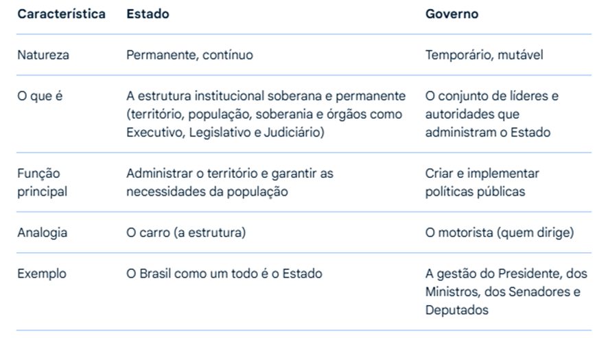 De início, cabe ressaltar a diferença entre “Estado” e “governo”. O Estado é a entidade permanente, incluindo o território, a população e a soberania, com suas instituições fixas (Executivo, Legislativo e Judiciário). Já governo é o grupo transitório de pessoas que exerce o poder político dentro dessas instituições, liderando a administração e as políticas públicas por um período determinado.